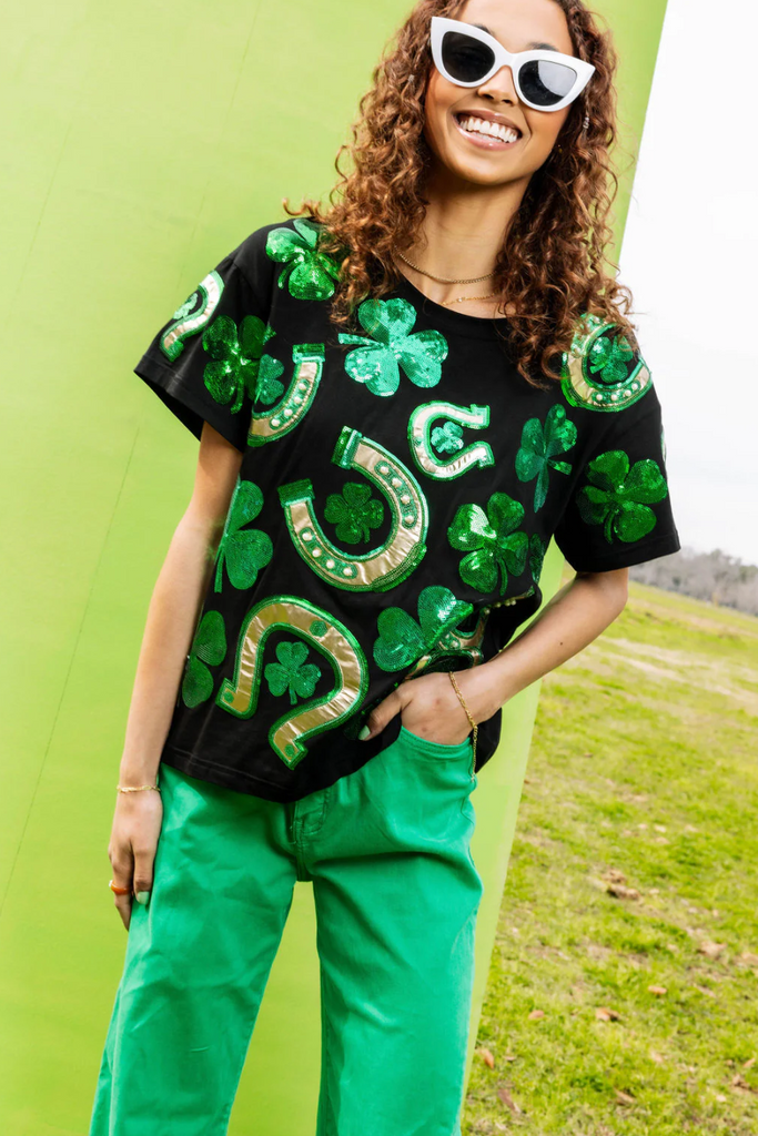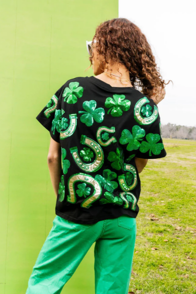 Short sleeve crew neck tee with St. Patrick's Day icon details.