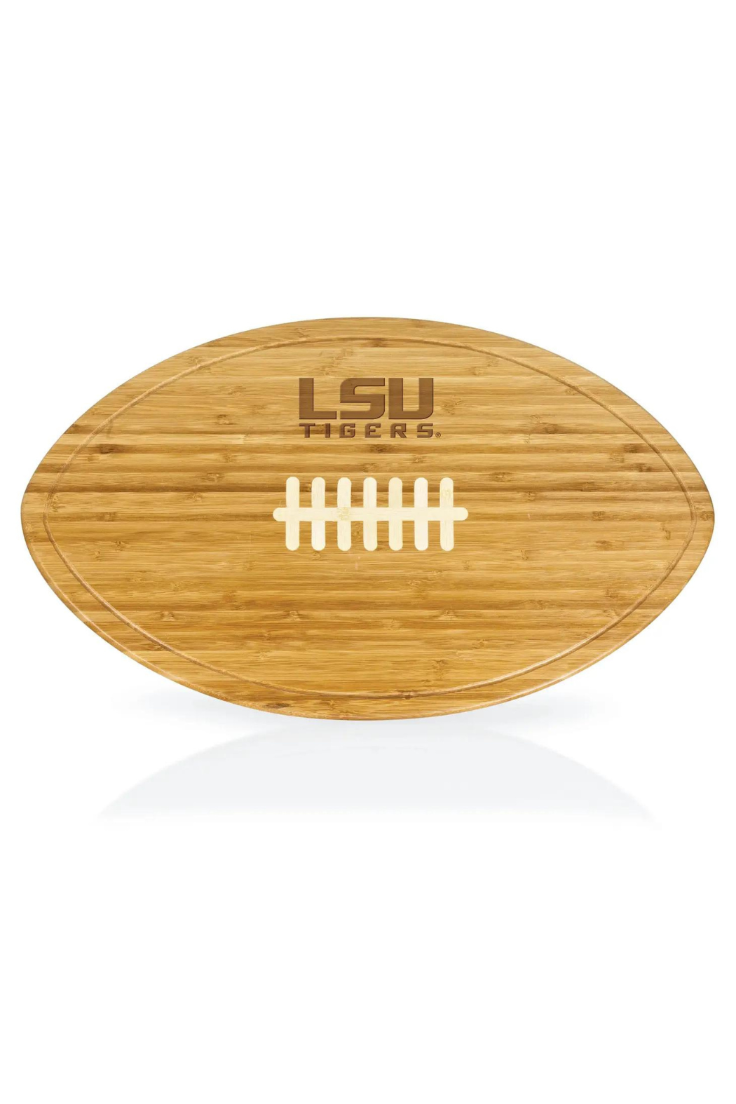It's game on with the kickoff cutting board, a football-shaped party platter and serving tray made from eco-friendly bamboo with a white bamboo inlay design for the "laces." a recessed juice groove keeps your table clean and tapered sides make it easy to rush this chopping board for many yards!