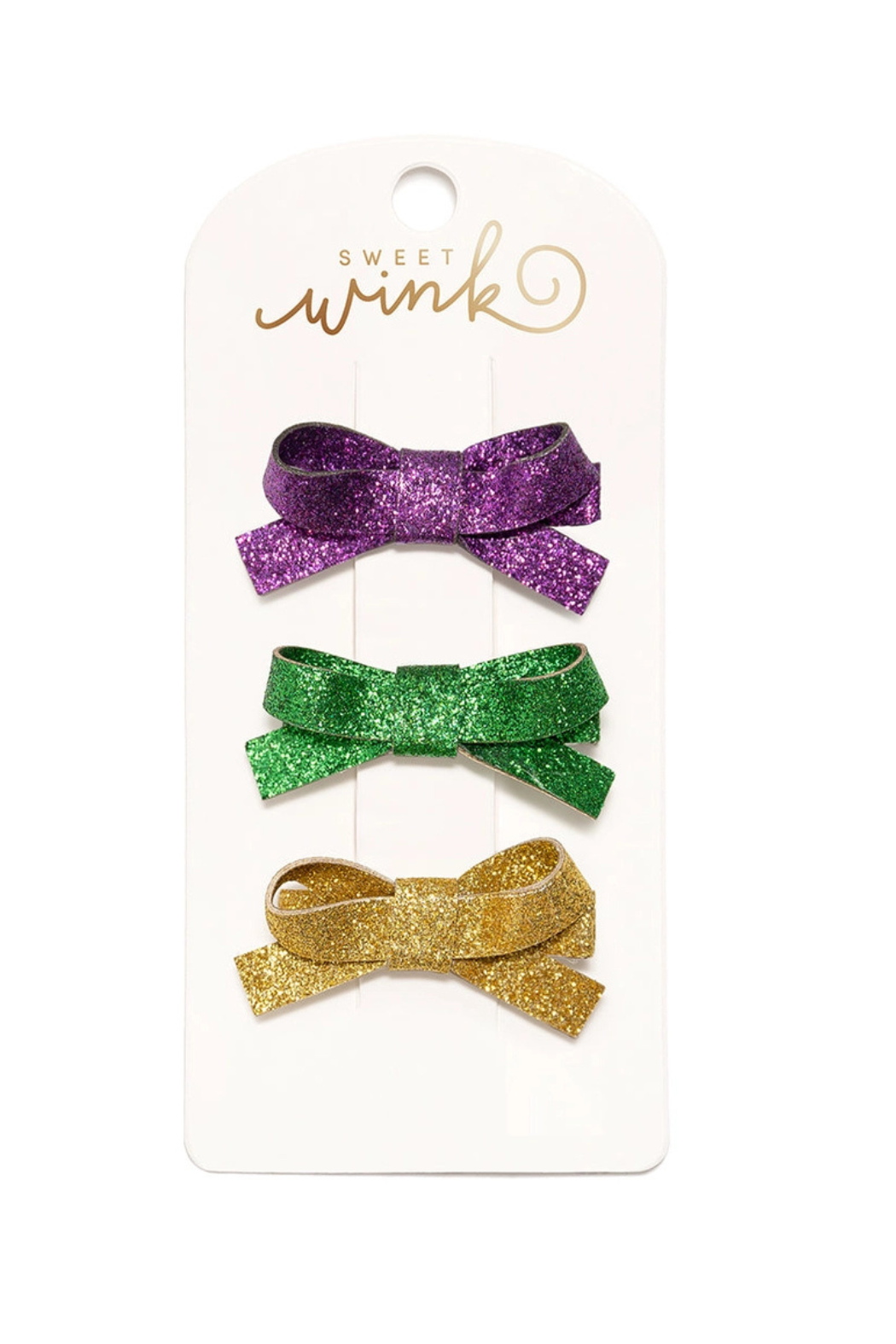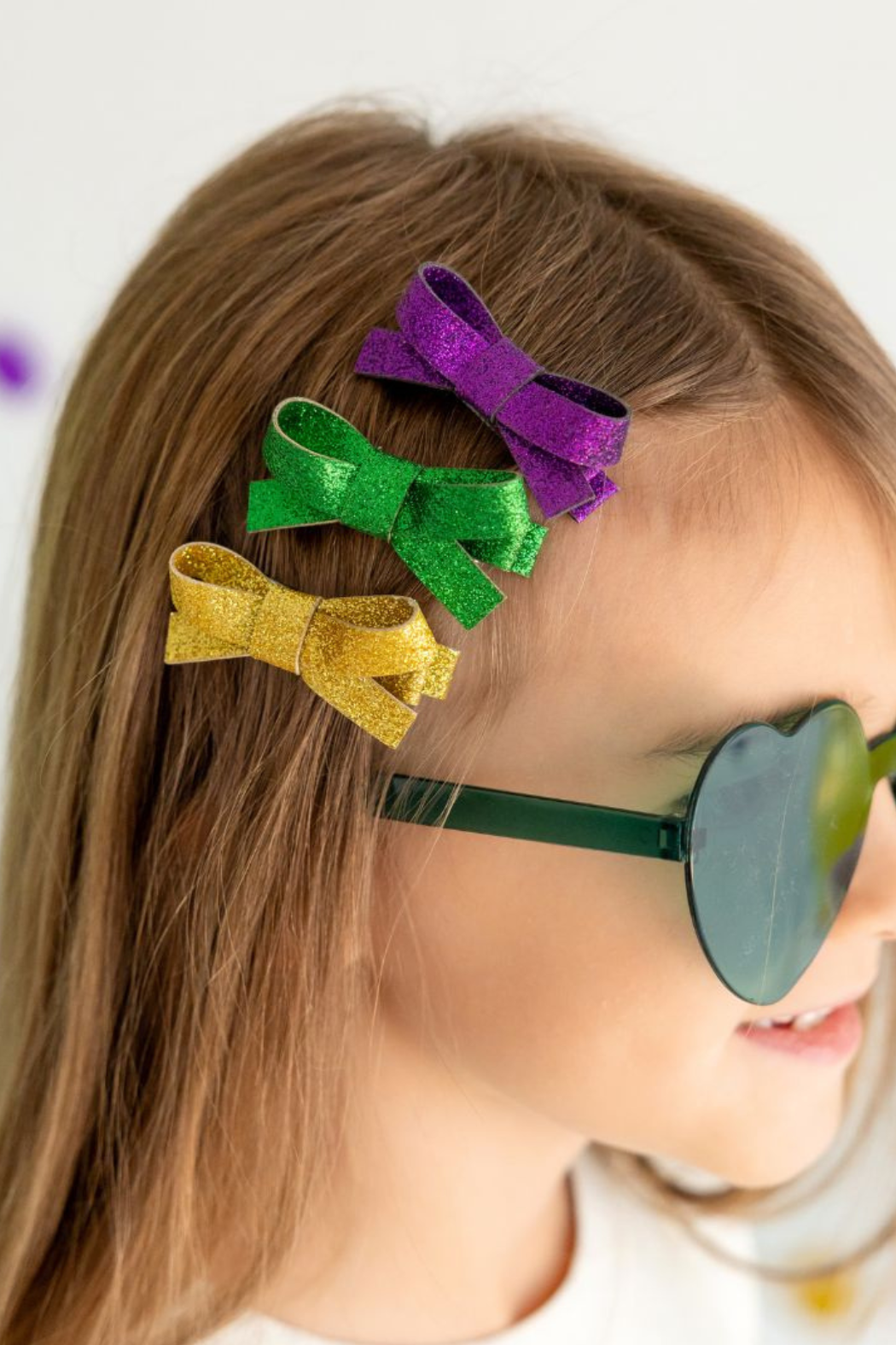 Every little girl needs the perfect hair clip to complete her look! The Mardi Gras Bow Clip Set is the perfect hair accessory for any Mardi Gras celebration or everyday wear.