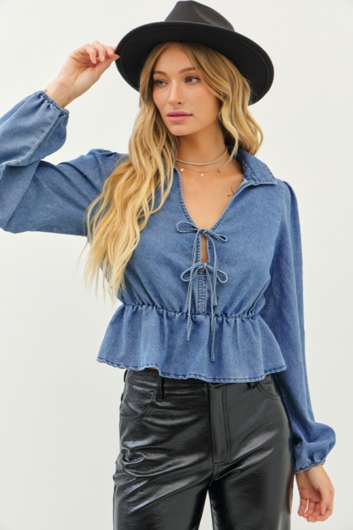 Effortlessly classic with a contemporary touch, this top is featured in a washed cotton denim fabric with a drop waist silhouette and front ribbon tie details.