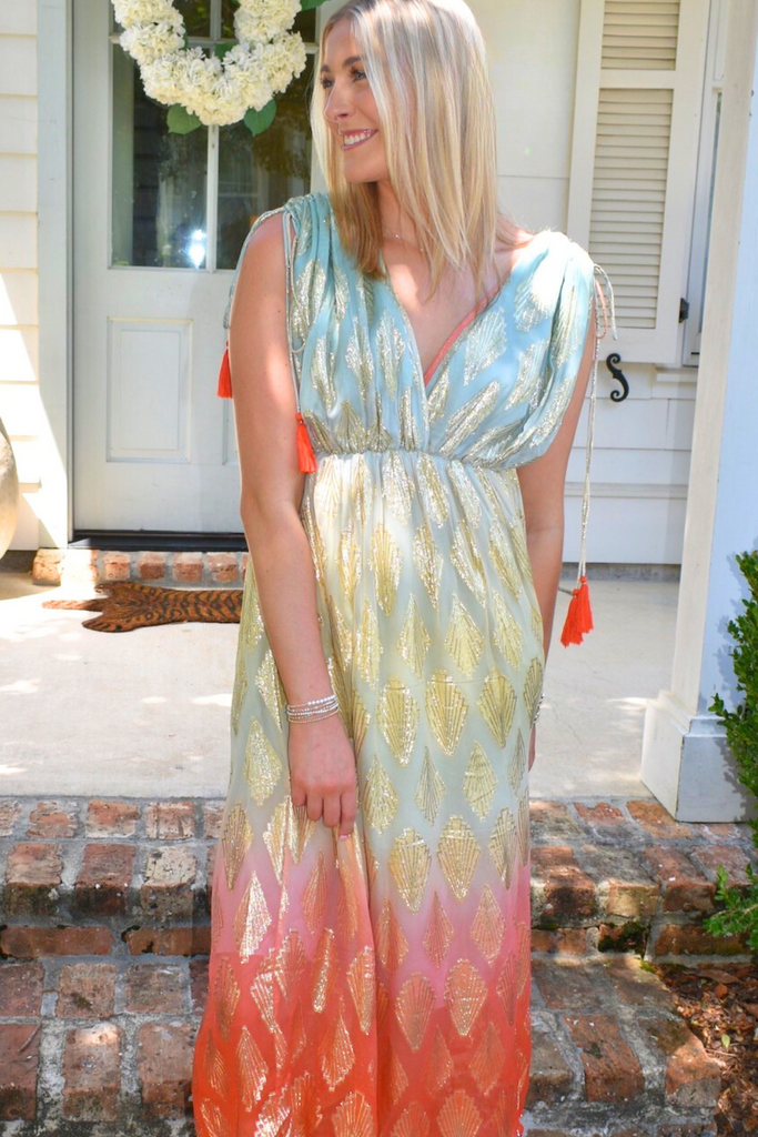 Magnolia Lurex Kaftan – a vision of beauty and effortless elegance that whispers of enchantment and grace. The kaftan's ombre effect captures the subtle transition of colors, from the soft blush of dawn to the deep, velvety hues of sunset. It's a symphony of shades that evokes the magic of a summer sunset, casting a warm and radiant glow wherever you go.