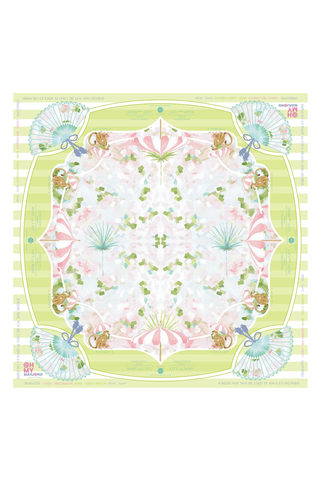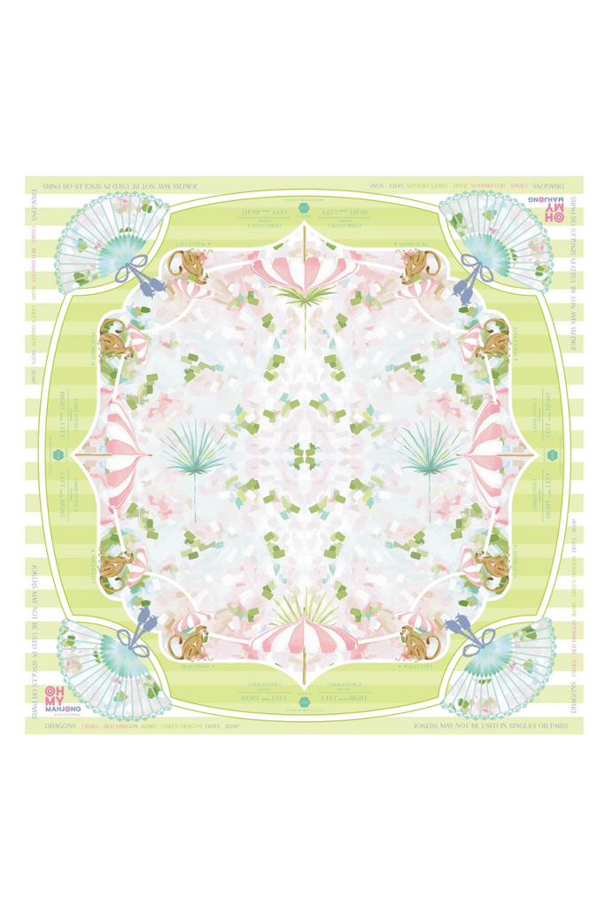 The Capri Mahjong Mat, crafted in collaboration with Catherine Cartie, brings a slice of Italian beauty to your game table. Designed to complement the lively Limoncello Tiles, this mat is full of captivating purple, pink, and green shades. The Capri mat is a vibrant masterpiece inspired by coastal Italian vibes and warm, sunlit days. Made from neoprene for easy cleanup and featuring a secure rubber non-slip backing, Capri ensures a flawless playing experience. Instructional reminders line the edges for a game that’s as smooth as it is stylish.