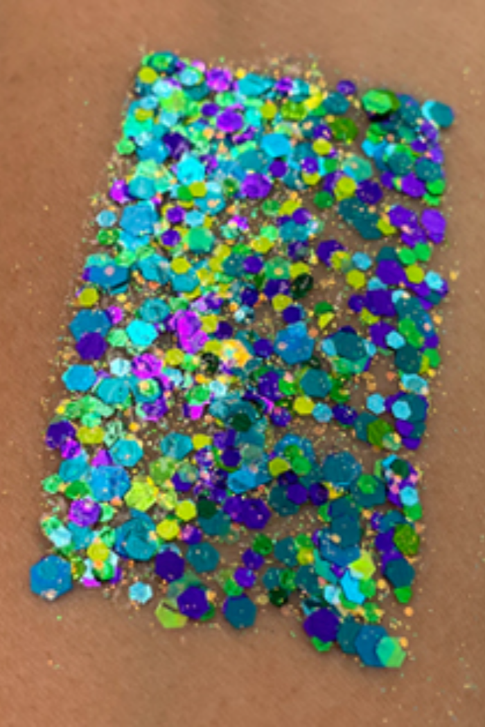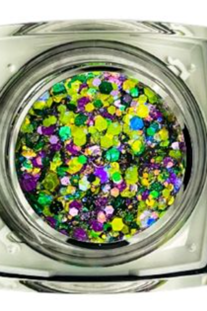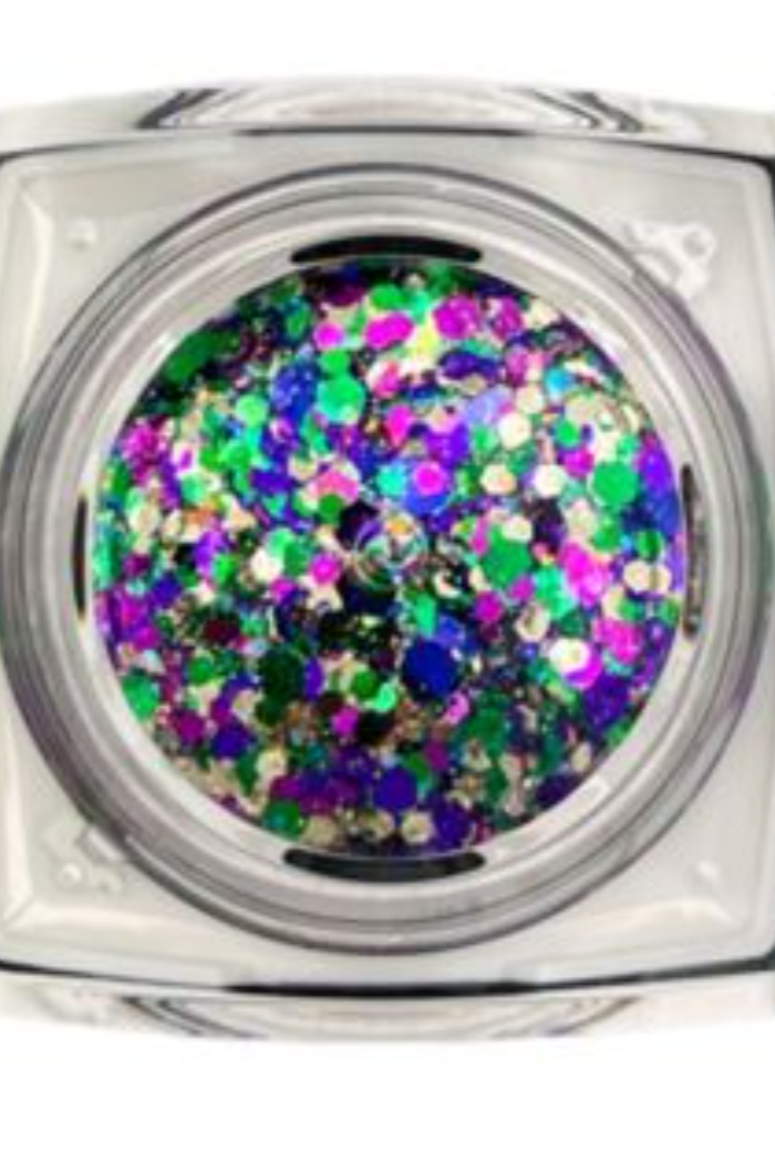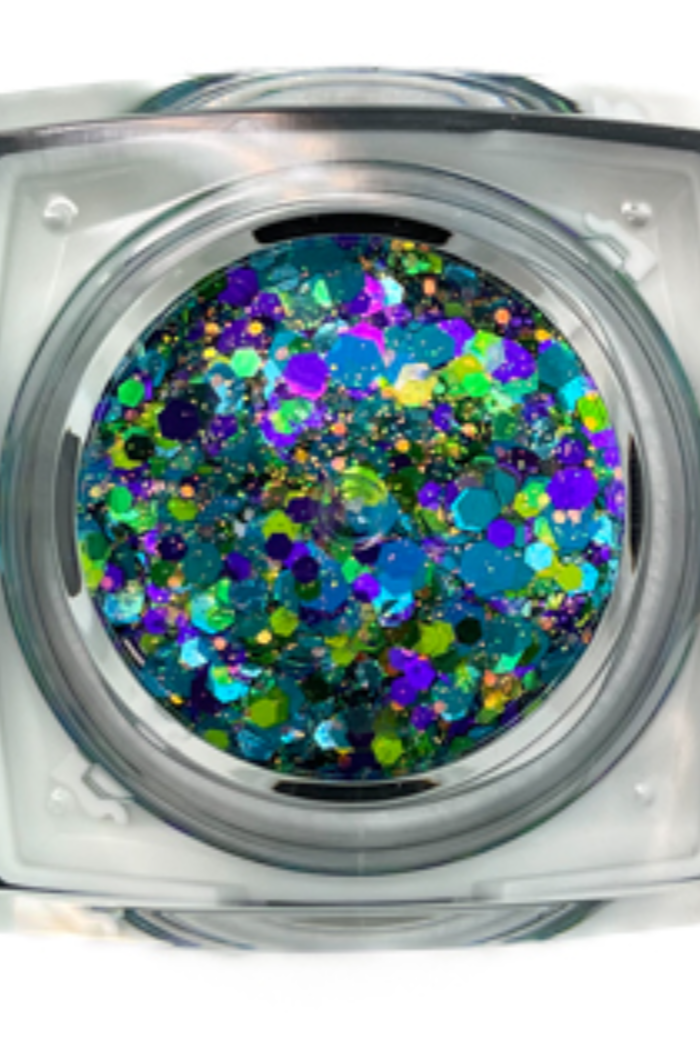 Elektra Cosmetics Bolt Balm is an intense blend of chunky and fine glitters custom mixed in an aloe vera gel base. It’s perfect for hair, body, face, or highlight but is NOT eyelid safe.