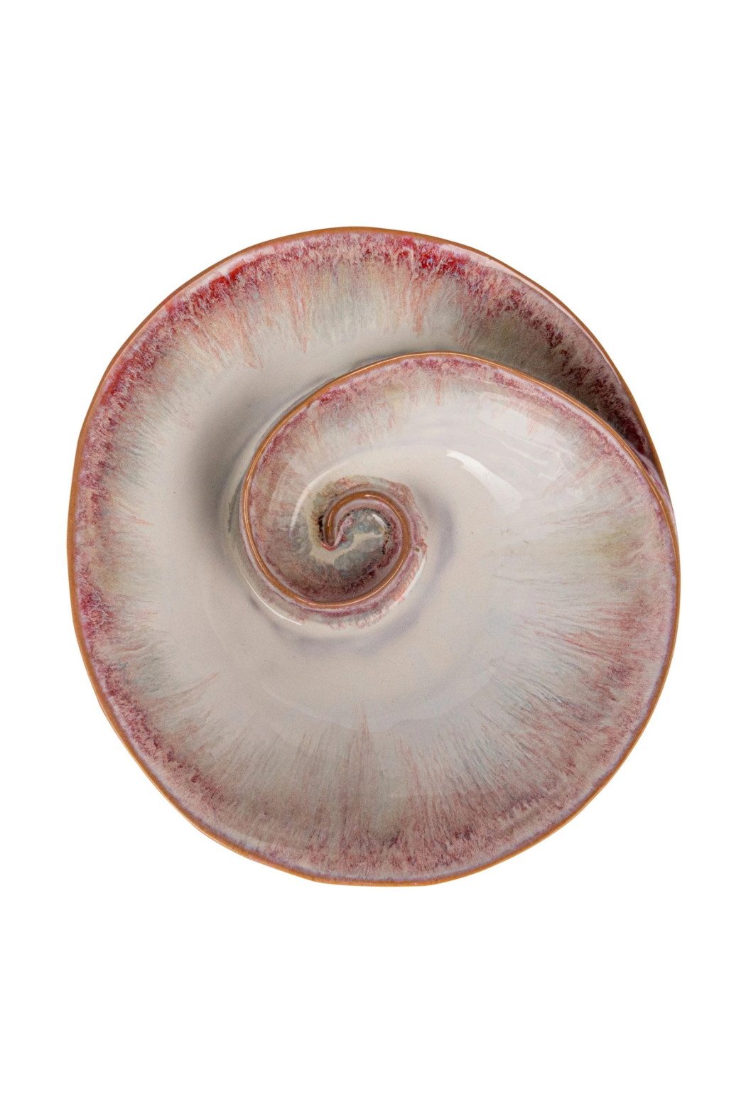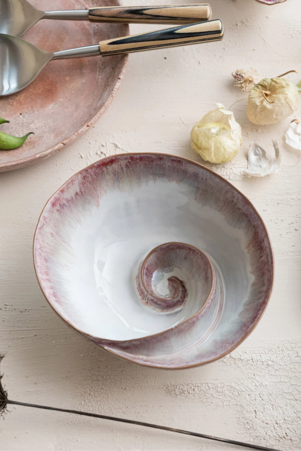 This Nautilus Essence Stoneware Bowl is a functional piece of art, drawing inspiration from the natural beauty of the sea. The reactive glaze technique used creates a distinctive white and berry coloration, ensuring that each bowl is a unique creation. The bowl's dimensions of 8.75 inches in length, 7.75 inches in width, and 3.25 inches in height make it an ideal size for serving a range of dishes, while its nautilus shape adds an element of sophistication to the dining experience. Whether used for serving food or as a centerpiece, this bowl's enchanting design and food-safe quality make it a valuable addition to any kitchen or dining room.