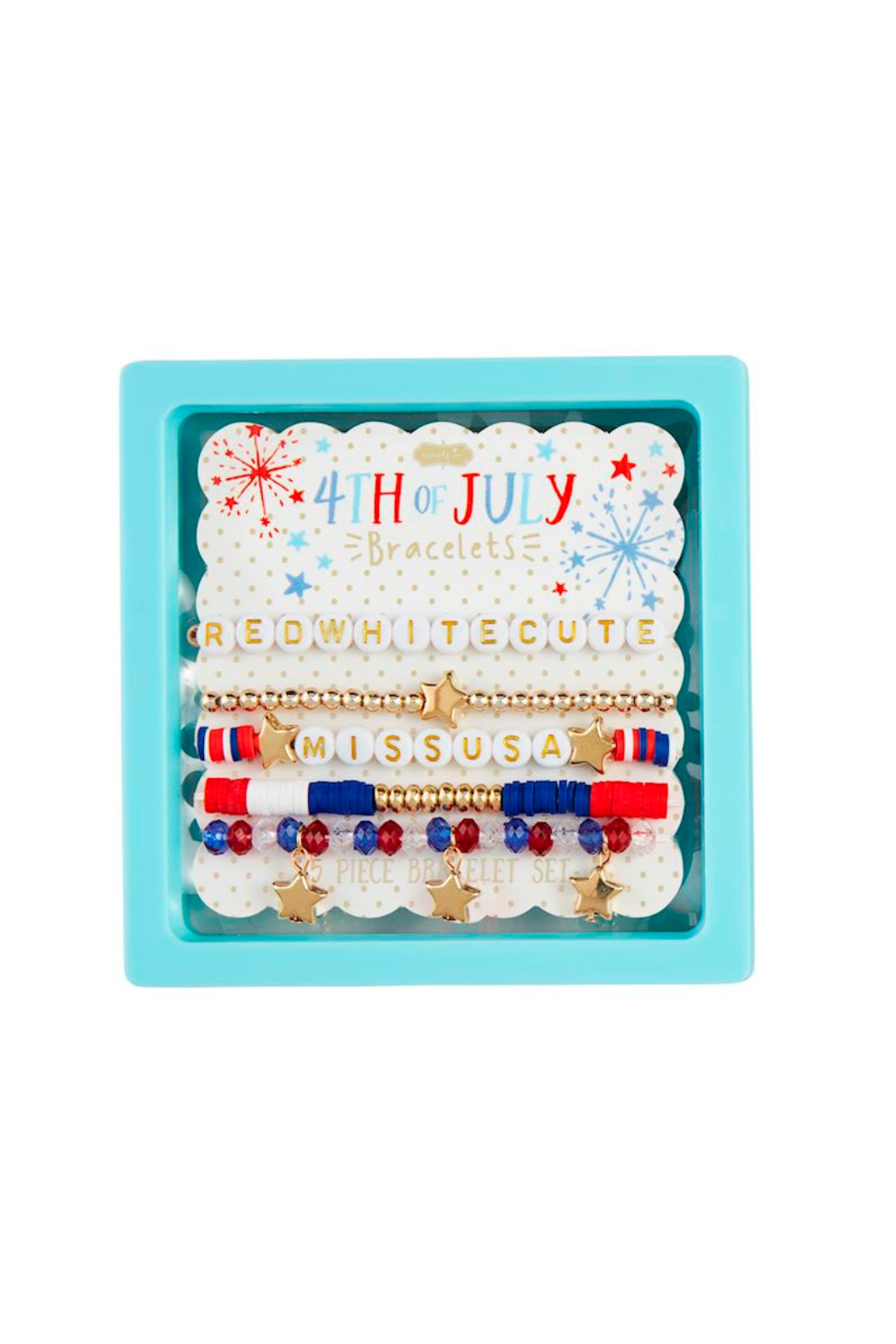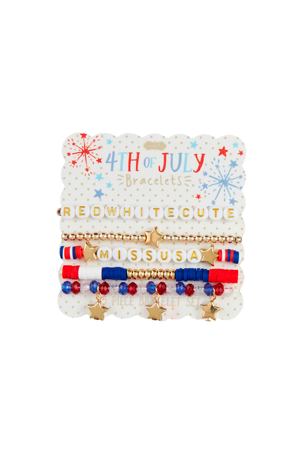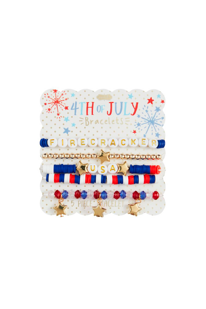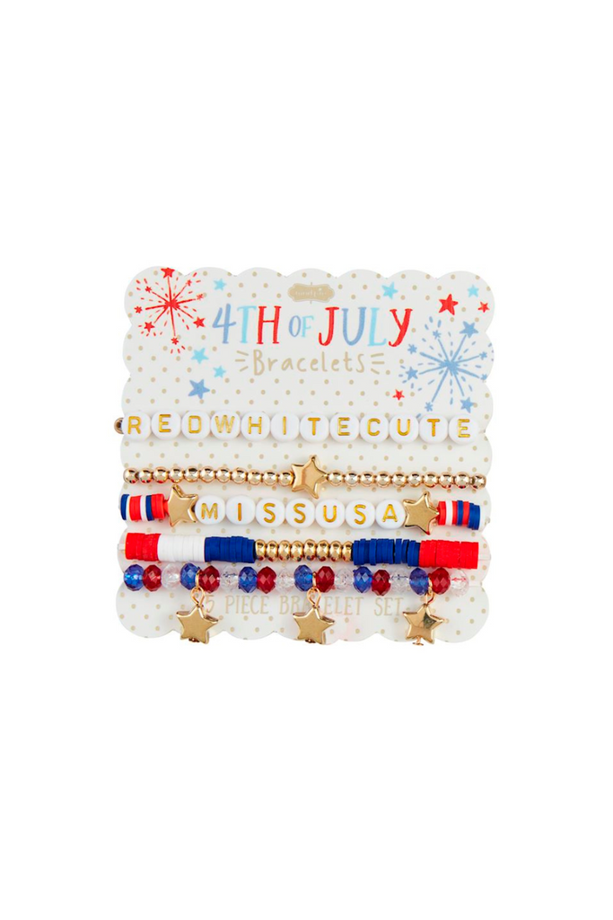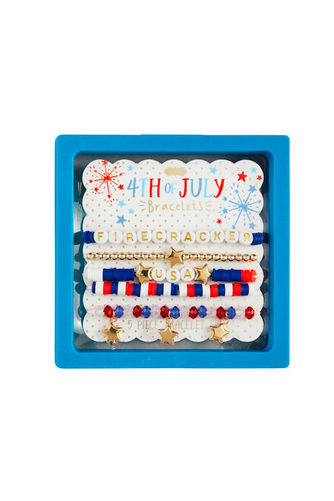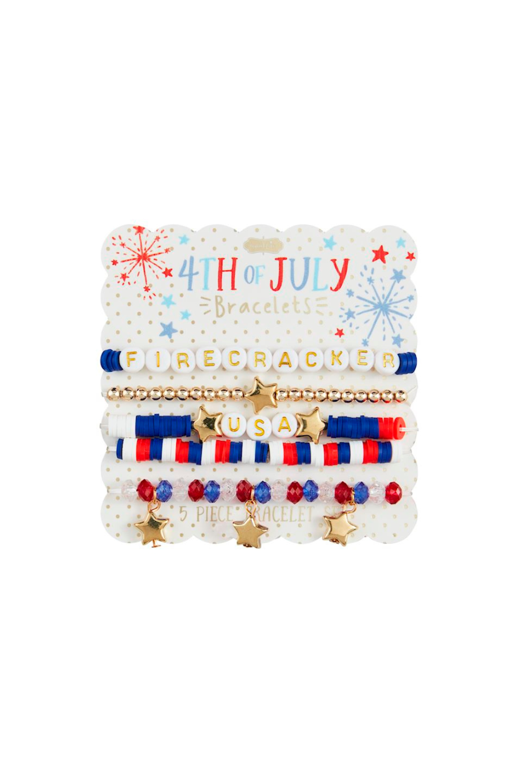 Set of five petite bead stretch bracelets come on display card in colorful gift packaging.