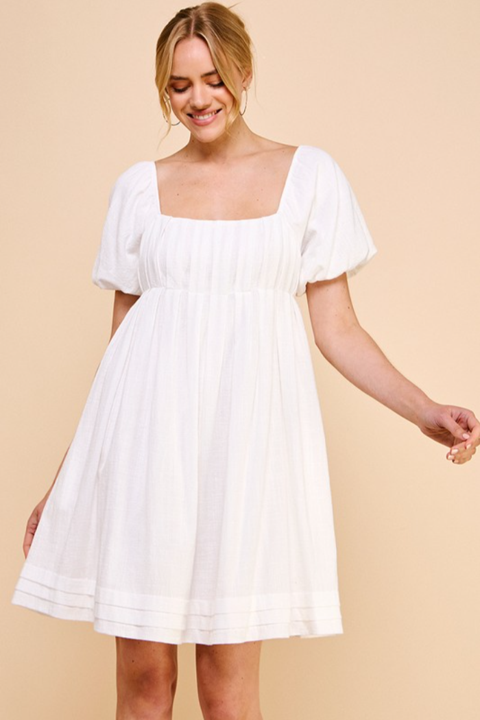 Textured Woven Puff Sleeve Pleat Detail Babydoll Smocked Back Dress, Lined with Pockets