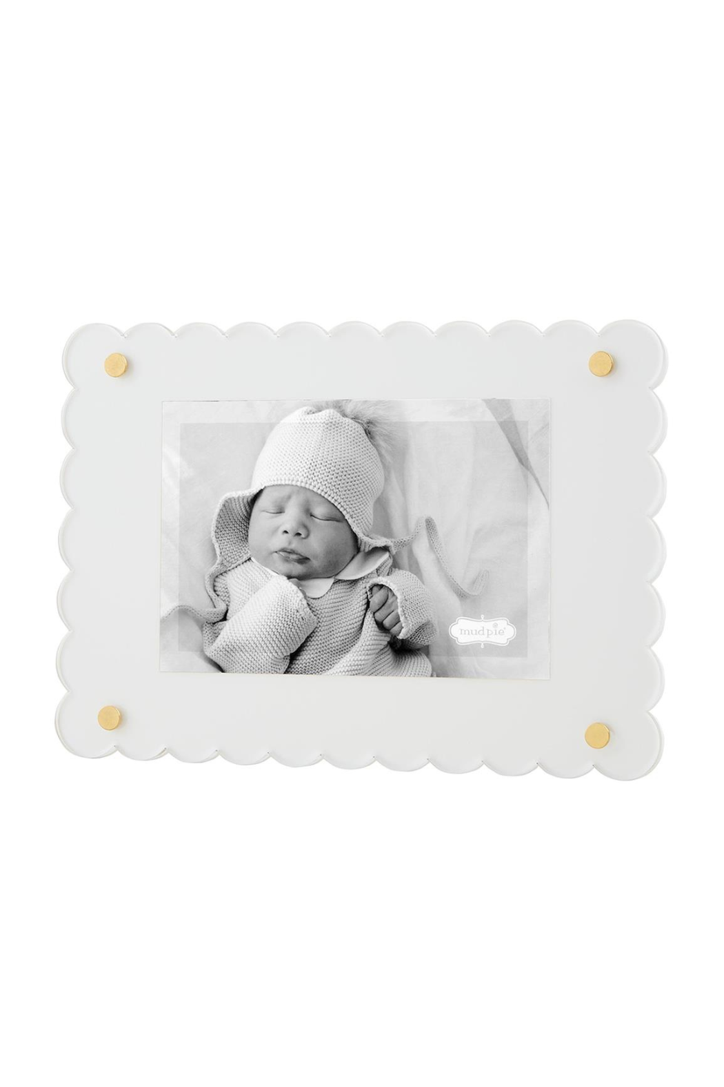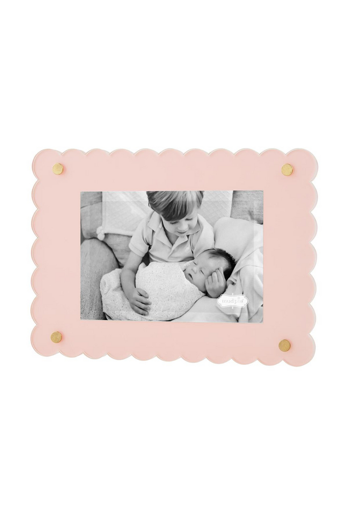 Scalloped acrylic 5" x 7" frame with brass rivet detail. Easel back.