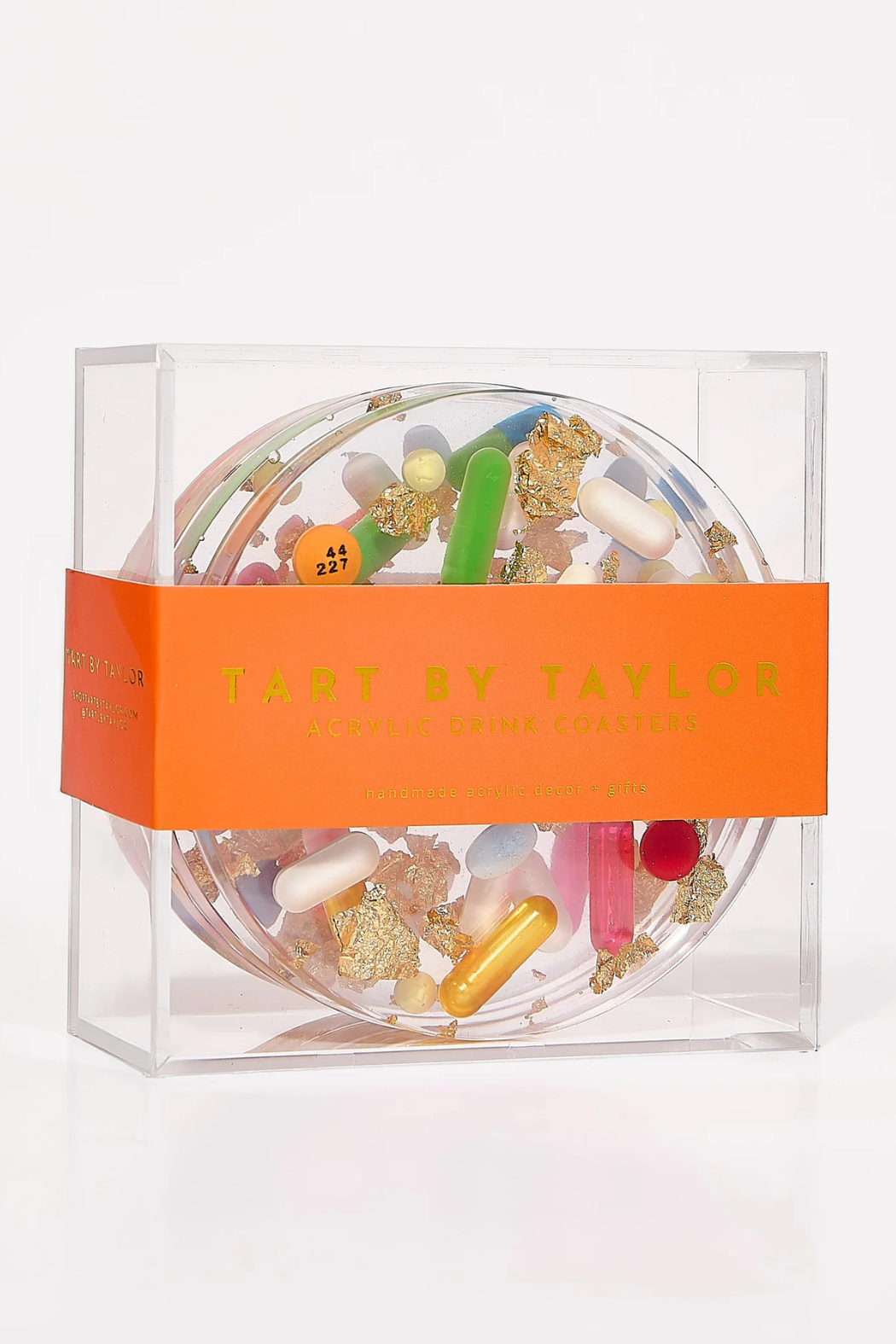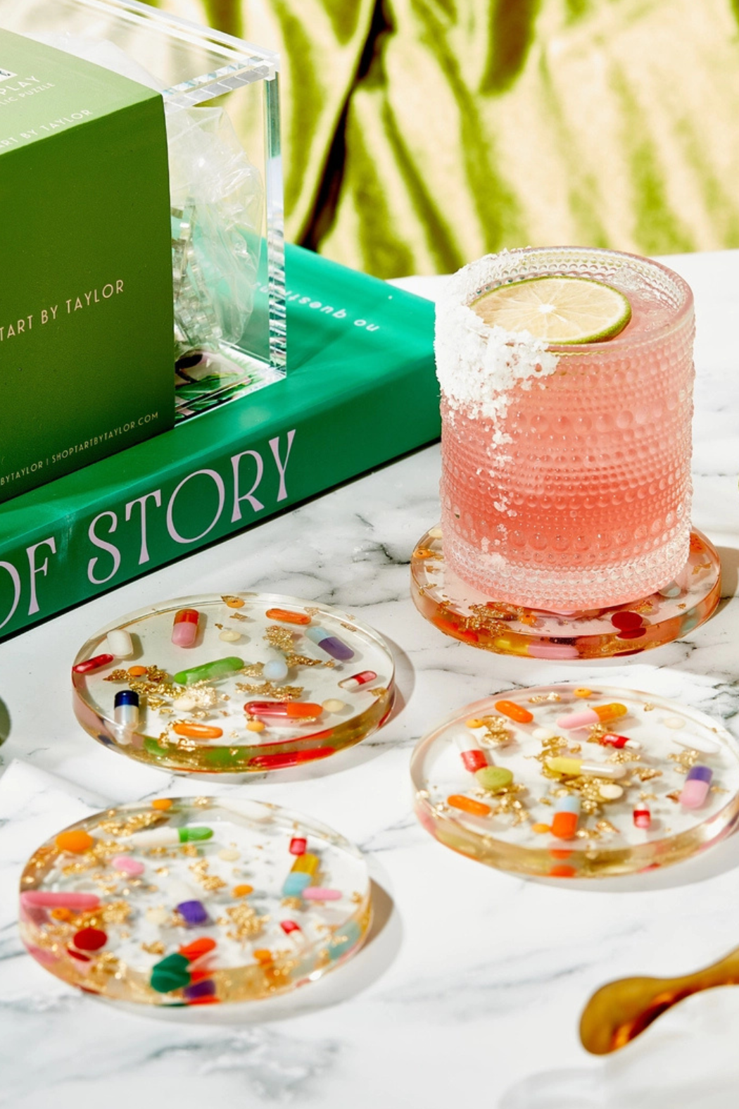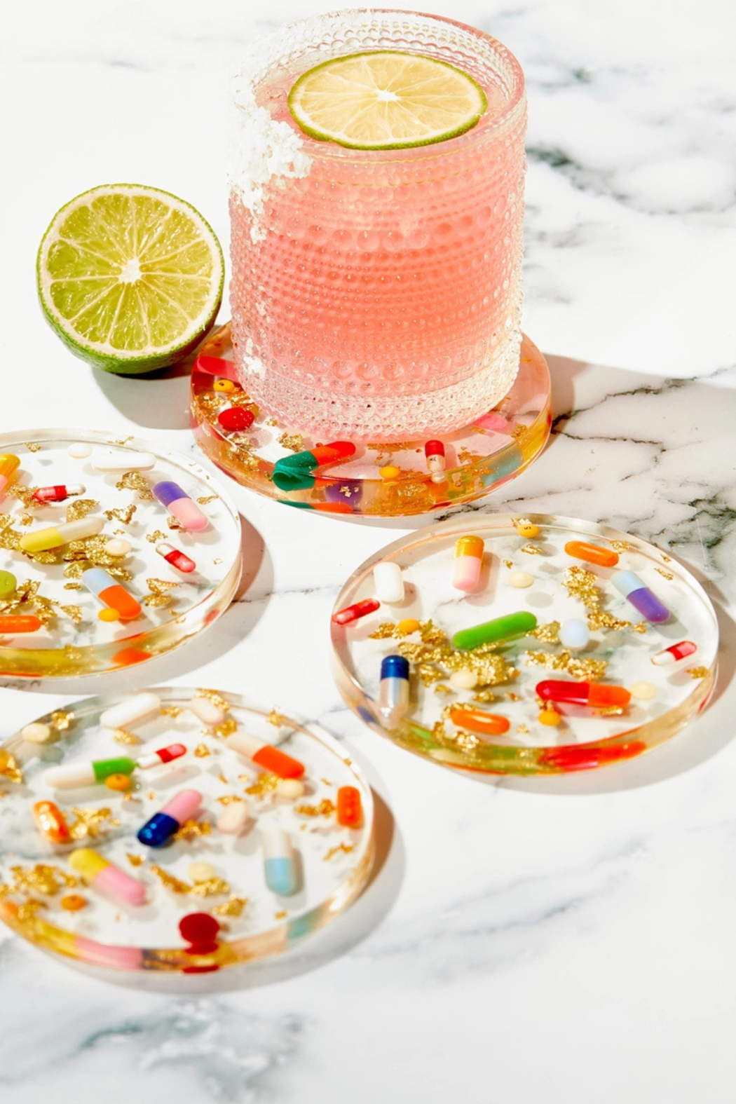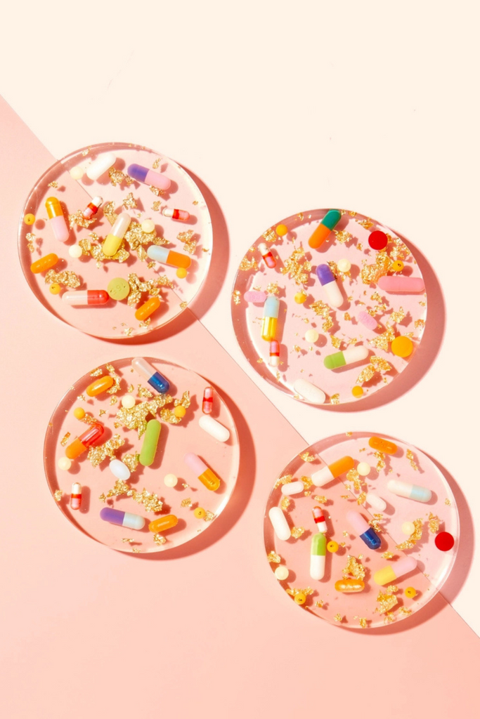These coasters are made for the person that lives to be a little extra! Sassy and fun, these coasters feature various over the counter medications, hand-filled sprinkle/glitter capsules and gold flake background layer.