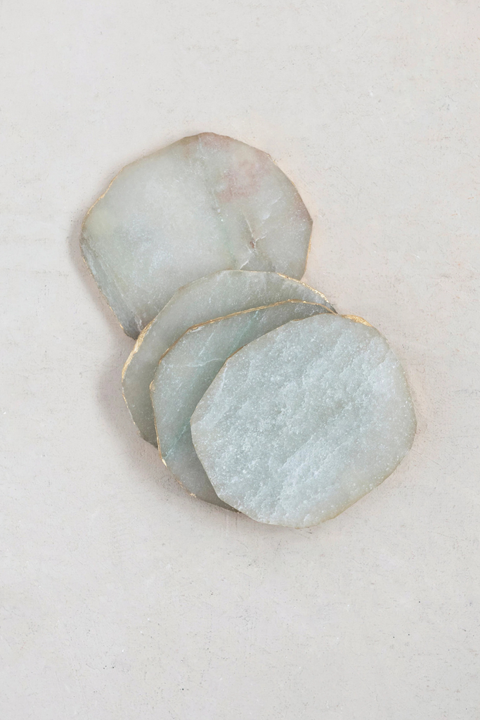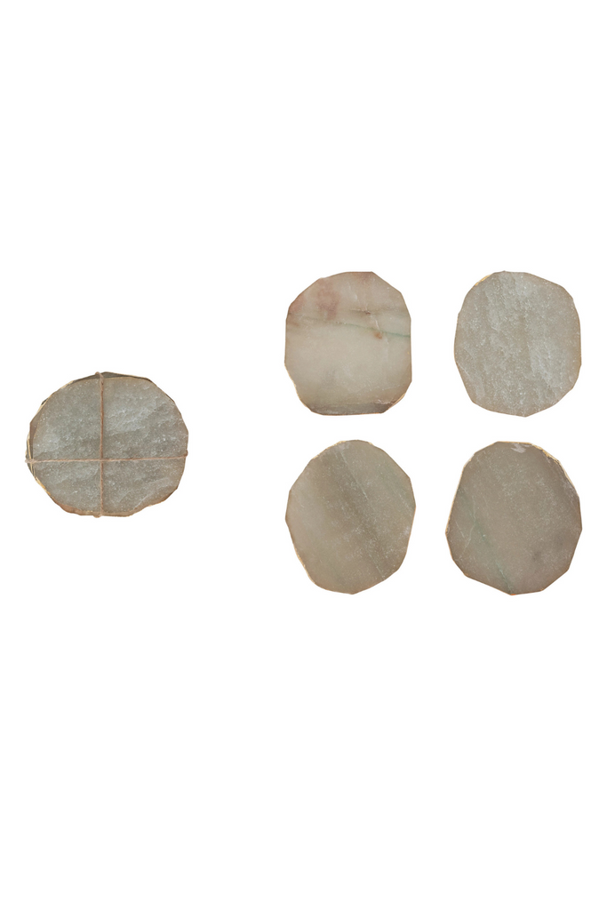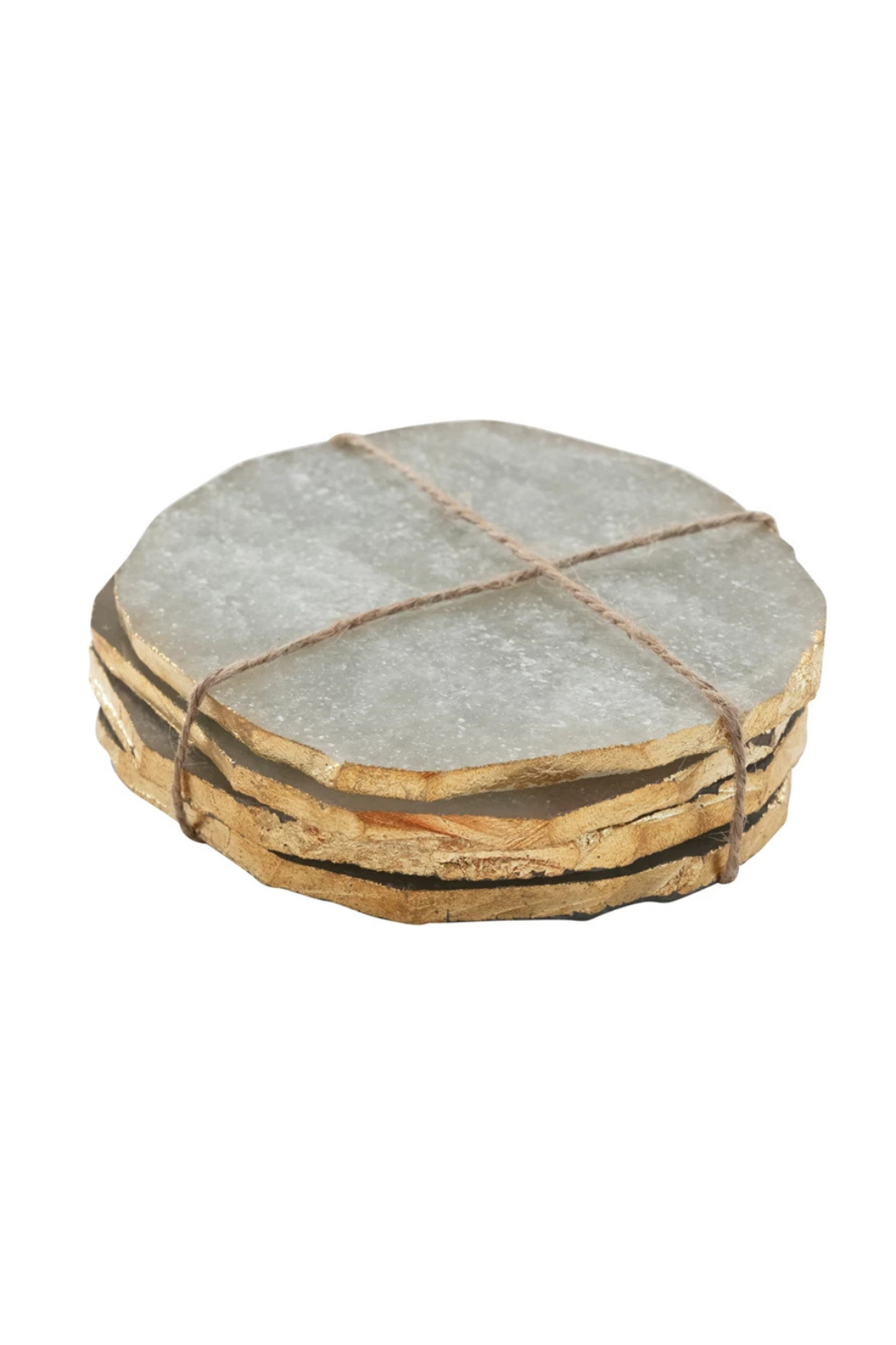 4" Round Quartz Coasters w/ Gold Finish Edge, Set of 4 Tied w/ Jute (Each One Will Vary)