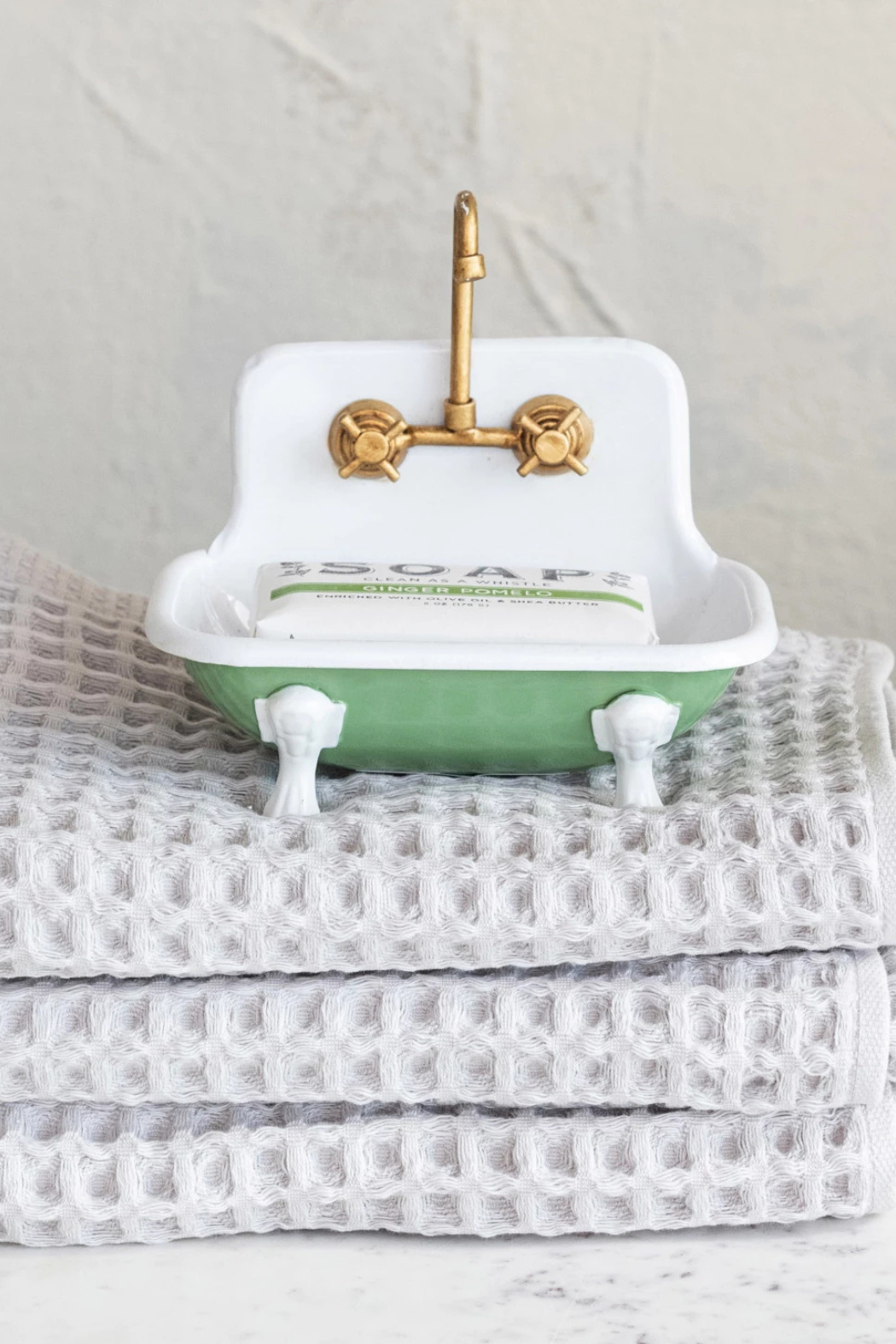 This Metal Soap Dish, with its unique sink and faucet design, is finished in an elegant grey and gold, adding a touch of sophistication to the bathroom setup. The piece measures 5.75 inches in length, 4.25 inches in width, and 4.5 inches in height, providing ample space for soap without taking up too much room on the countertop.