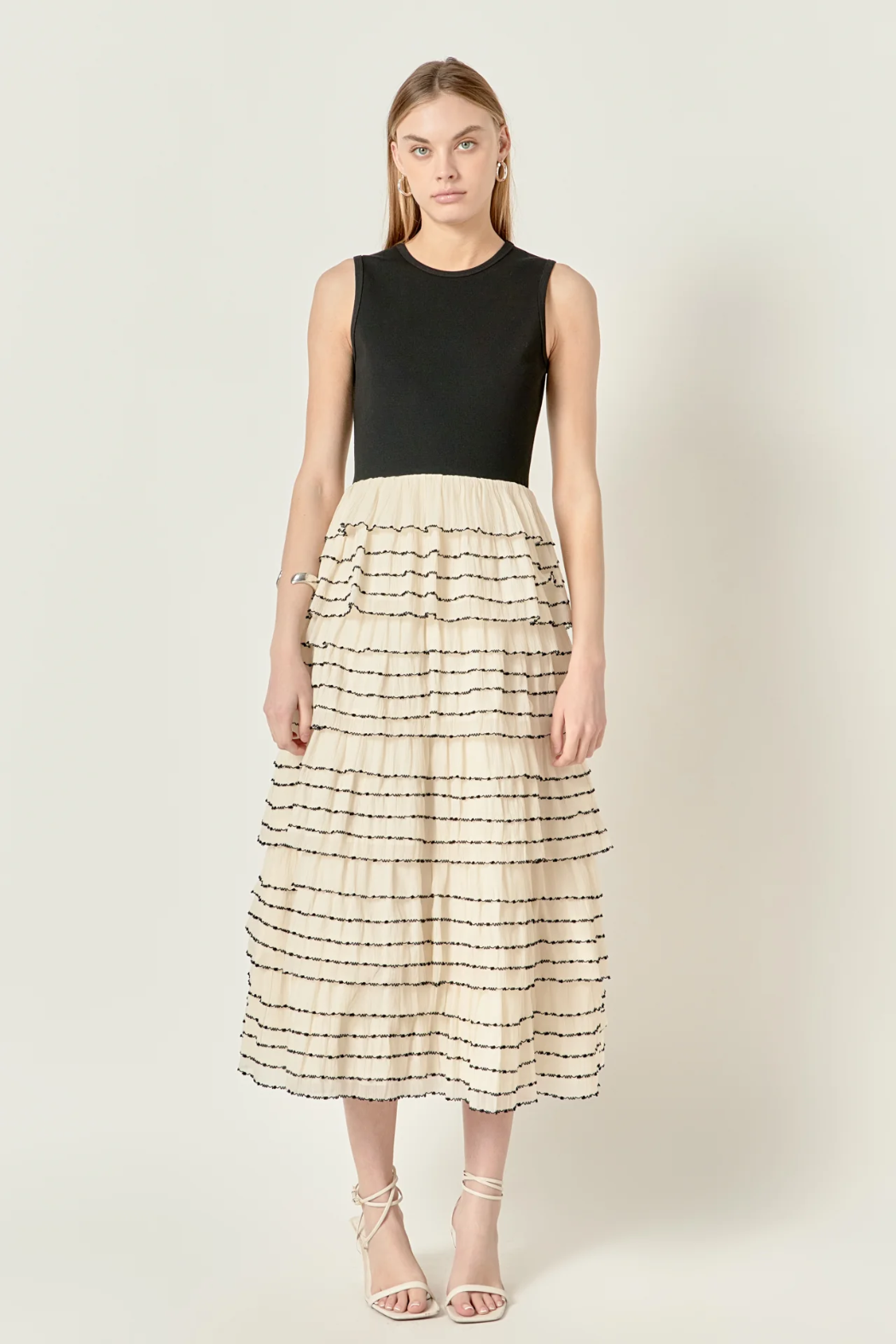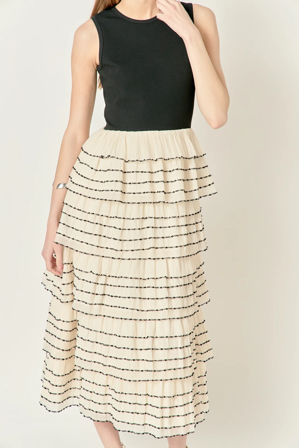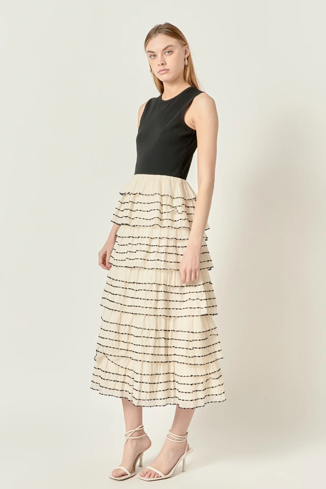 Featuring a classic round neckline and a breezy sleeveless design, this dress offers comfort without compromising sophistication. The flowing maxi length brings a touch of drama, while the tiered ruffle skirt adds movement and feminine charm. Crafted from high-quality fabric with a timeless check pattern, it’s a versatile wardrobe essential that can easily be dressed up or down. Whether you're heading to brunch or a summer soirée, this standout dress is your go-to for easy elegance.