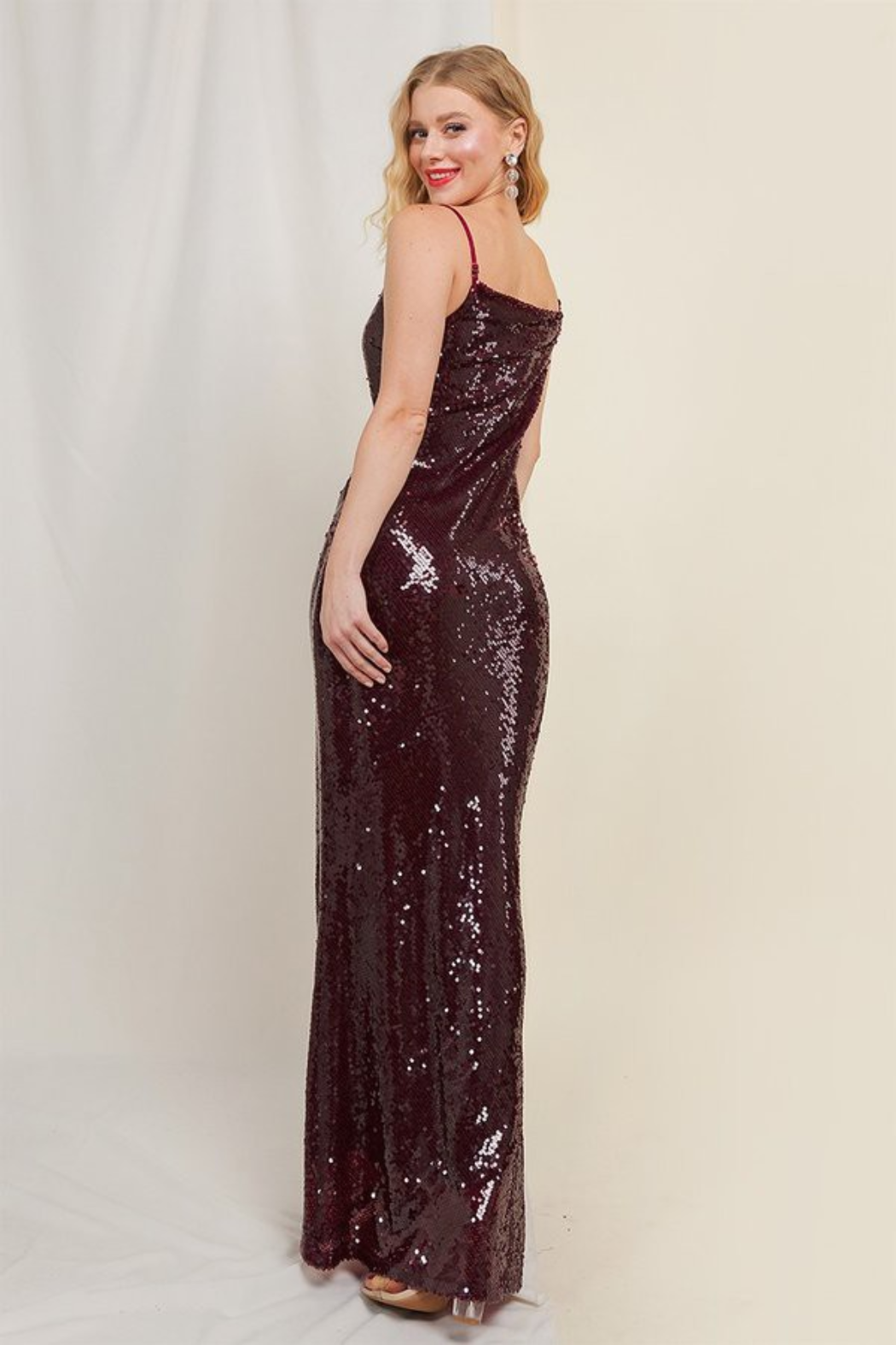 S/L Sequin Gown - Merlot / M is backordered and will ship as soon as it is back in stock.