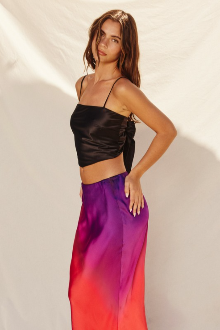 Straight neck cami top with a back tie closure, adjustable spaghetti straps, and a pointed hem.