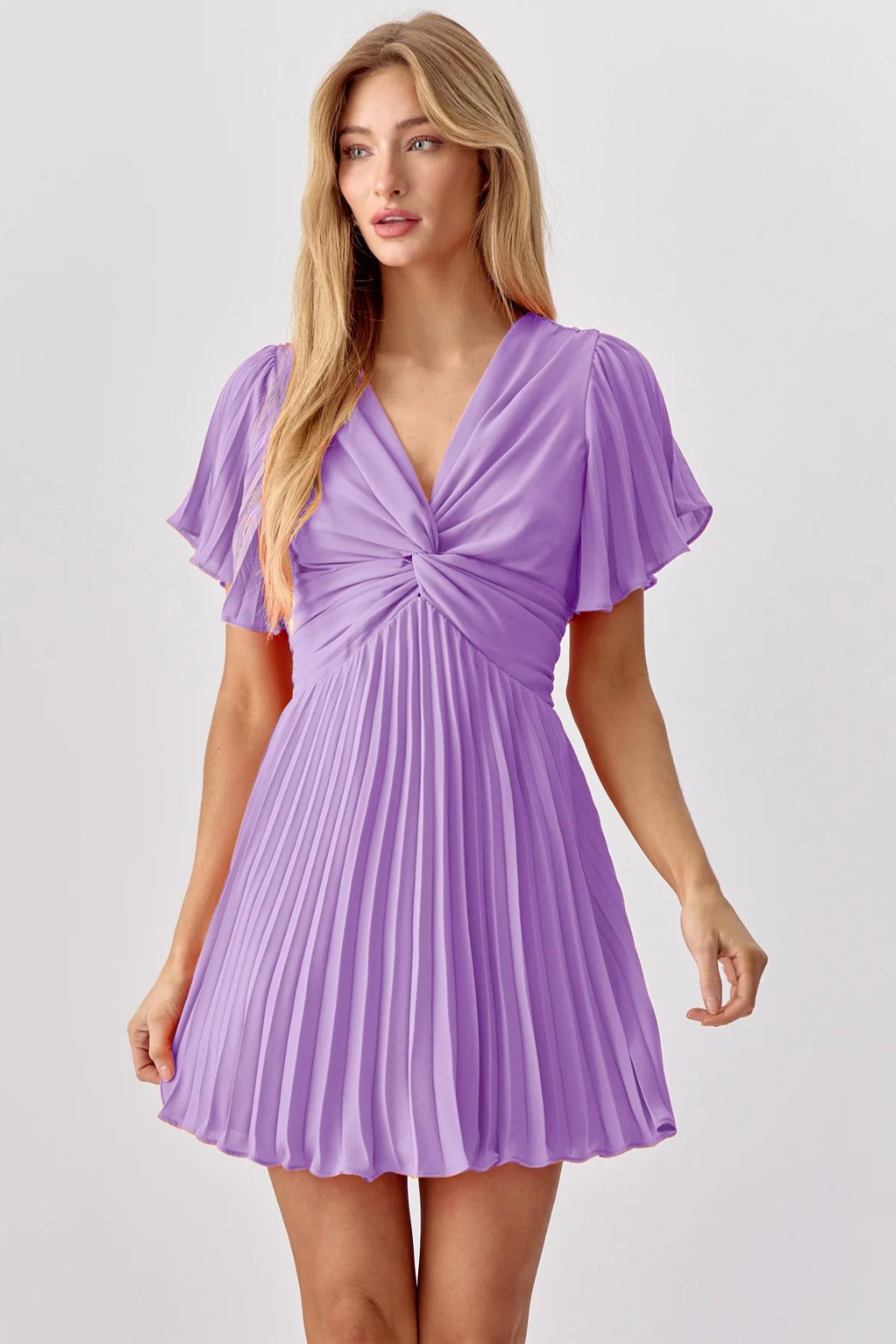 leated mini dress with twist front bodice and wide short sleeves. The skirt has a gorgeous flare out complimented by the V-neckline.