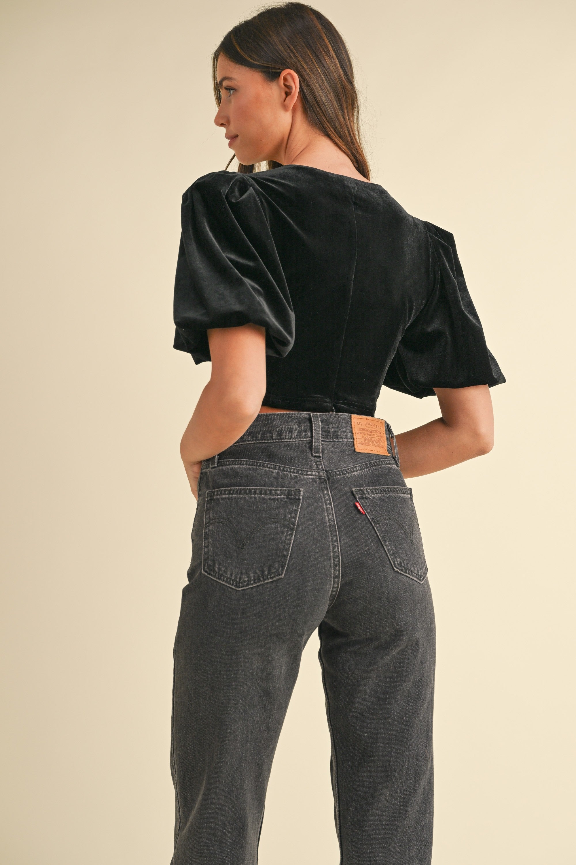 Short puff sleeve jewel rhinestone bow trimmed velvet blouse top. Lining.