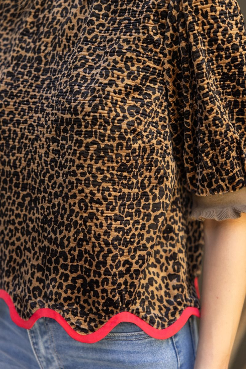Add bold texture to your wardrobe with our Velvet Animal Print Top W/Wavy Hem. Designed in soft ribbed velvet with a striking animal print, this top features short puff sleeves, elastic banded trims, and a playful contrast wavy hem for a pop of color. Finished with a back button-loop closure for easy wear. True to size.